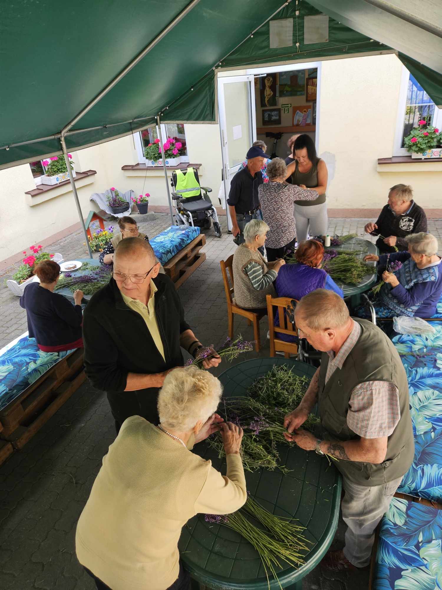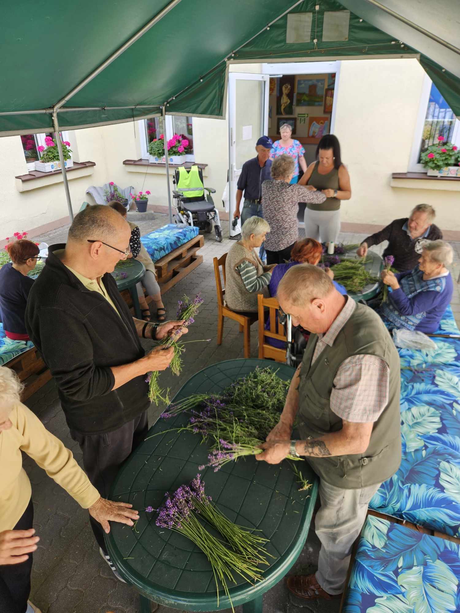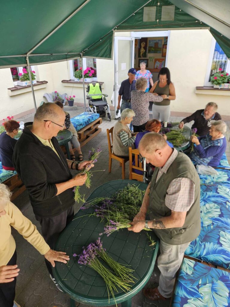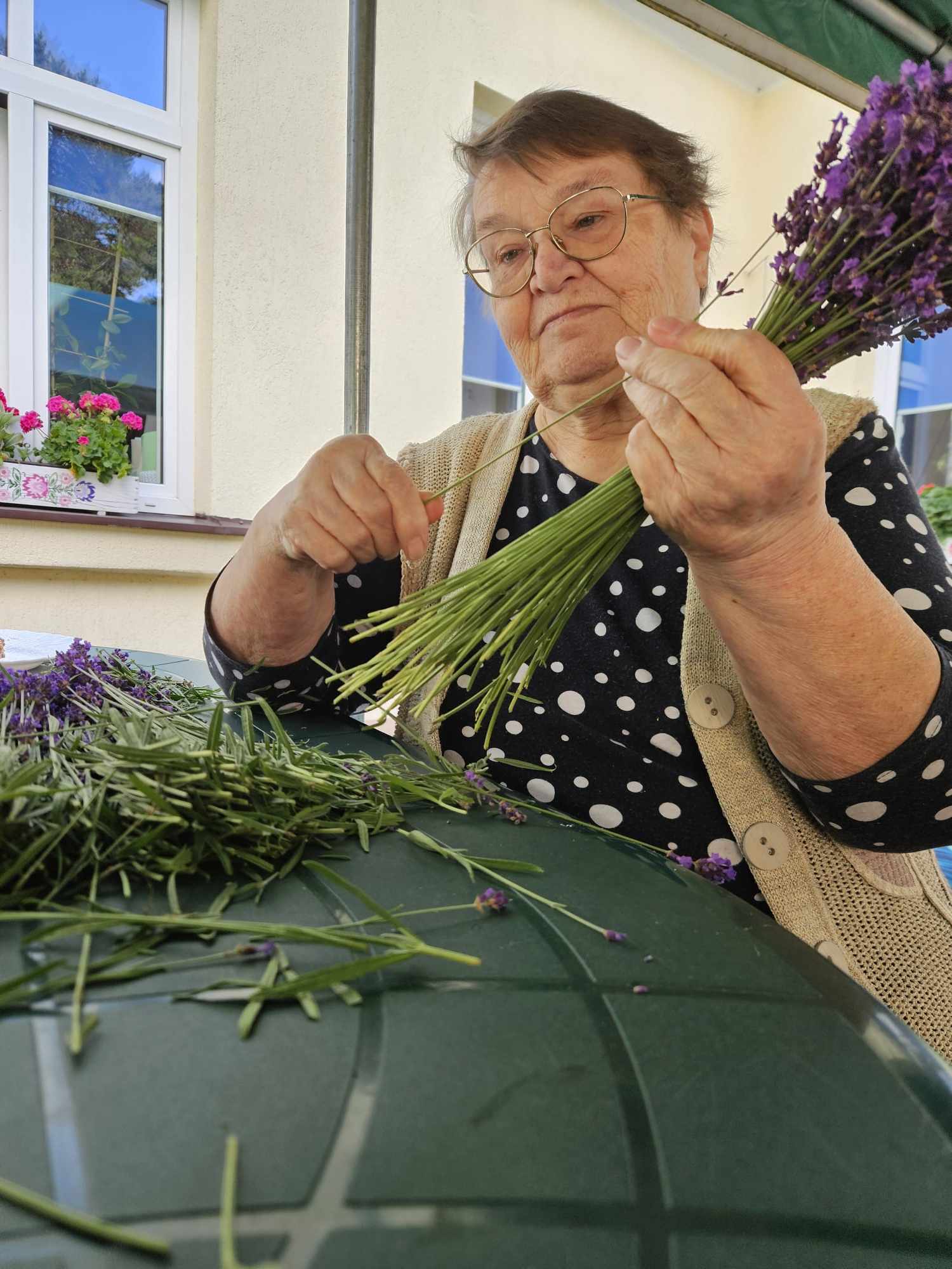 W tym roku nasza lawenda ma swoje żniwa miesiąc wcześniej. W tej chwili jesteśmy na etapie zbiorów- trwają lawendowe żniwa, przy których jest sporo pracy. Ucinamy ją sierpem a następnie kosiarką ręczną pozostałą roślinę równamy w formę półkuli. Po zebraniu kwiatostanów i ułożeniu w niewielkie bukiety będzie się suszyć. Lawenda stała się naszą pasją, a prowadzenie „Piwniczki pod lawendą” interesującym pomysłem na prowadzenie zajęć z hortikuloterapii. Tę niezwykłą roślinę i jej naturalne właściwości wykorzystujemy także w naszym codziennym życiu, tworzymy woreczki z suszu lawendowego a także syrop lawendowy, cukier lawendowy oraz dodajemy ja do aromatycznych herbatek .